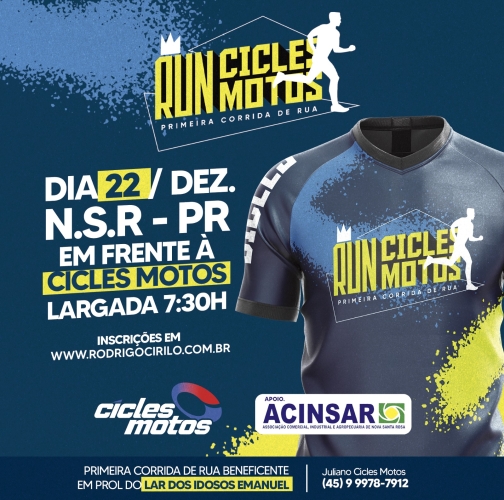 DATA: 22/12/2024 HORÁRIO: 07h30 CIDADE: NOVA SANTA ROSA – PR Local: CICLES MOTOS - NOVA SANTA ROSA Percurso: 4 e 8km CAMISETA PARA OS 100 PRIMEIROS INSCRITOS *Evento com vagas limitadas Distâncias